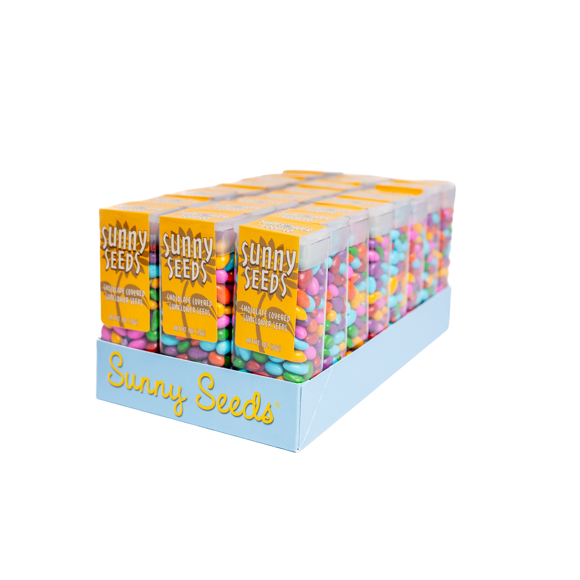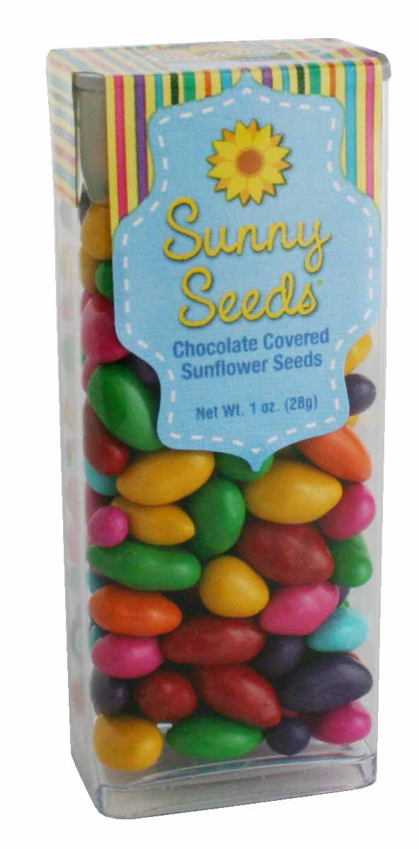 Chocolate covered sunflower seeds with rainbow candy coating! Mini style- 1oz. tube. Great for birthday party favors or snacks on the road.